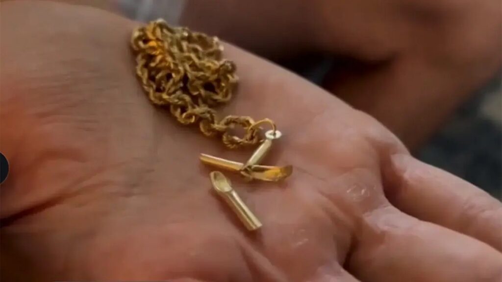 He was wearing his gold necklace with a cross pendant, which medics believe could have split the bullet — sparing his major organs from damage.