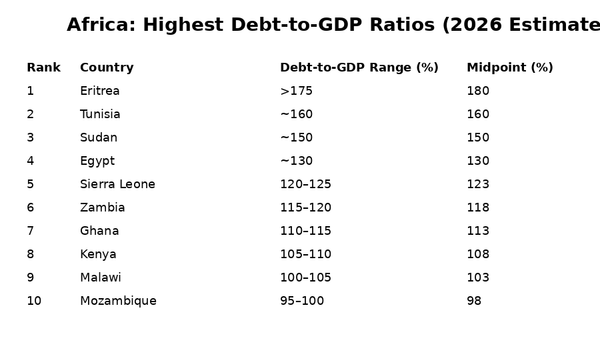The ranking is based on gross public debt as a share of GDP, using projections and estimates available up to late 2025 and early 2026. Data is drawn from the International Monetary Fund, World Bank, African Development Bank, national treasury publications, and central bank reports. Where official figures vary, median estimates are used to reflect a broader consensus.