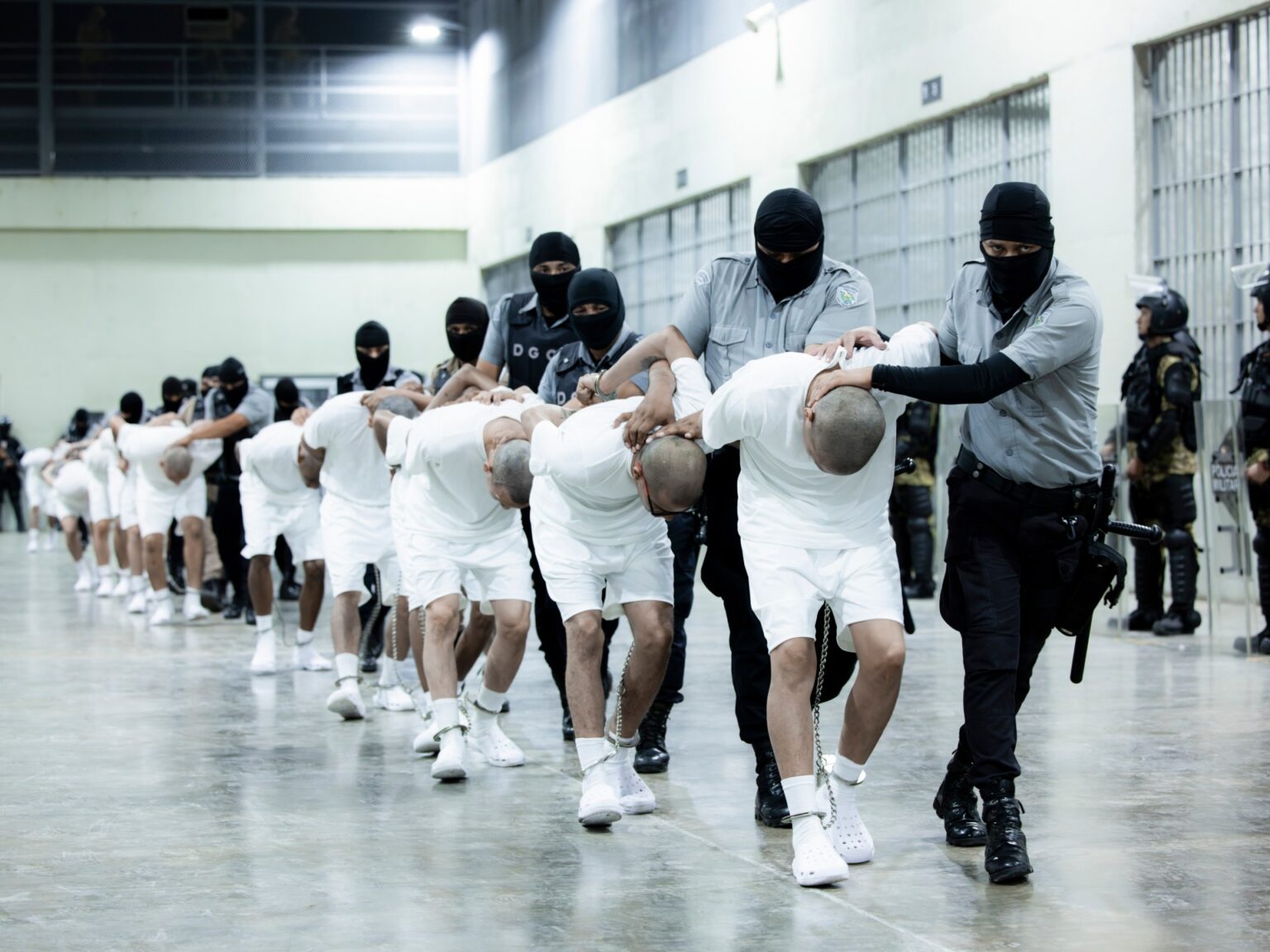 He shared a video of several men in handcuffs and shackles being transferred from a plane to a heavily guarded convoy, while the presidency shared a series of photos showing prisoners’ heads being shaved, and then hands manacled behind their backs, on their arrival in El Salvador.
